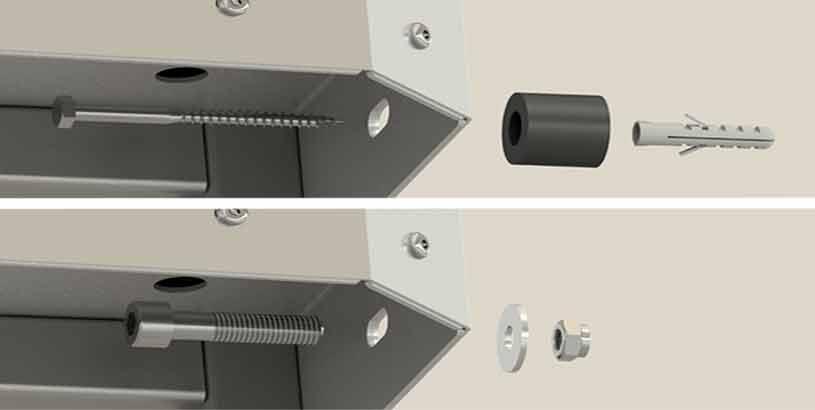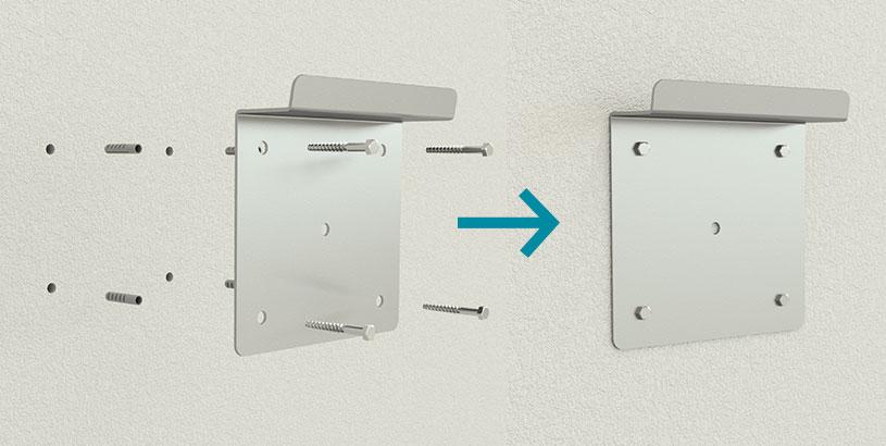 Zacznij od wywiercenia otworów i zamontowania wspornika ściennego (wspornik w zestawie wraz z wkrętami i zatyczkami).